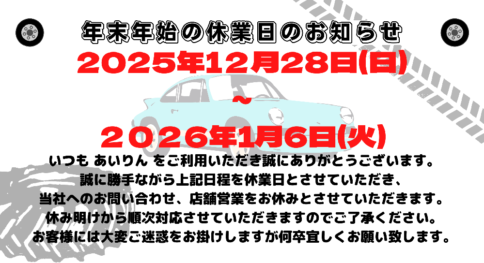 誠に勝手ながら、年末年始 2025年12月28日(日)〜2026年1月6日(火)、を休業日とさせていただきます。