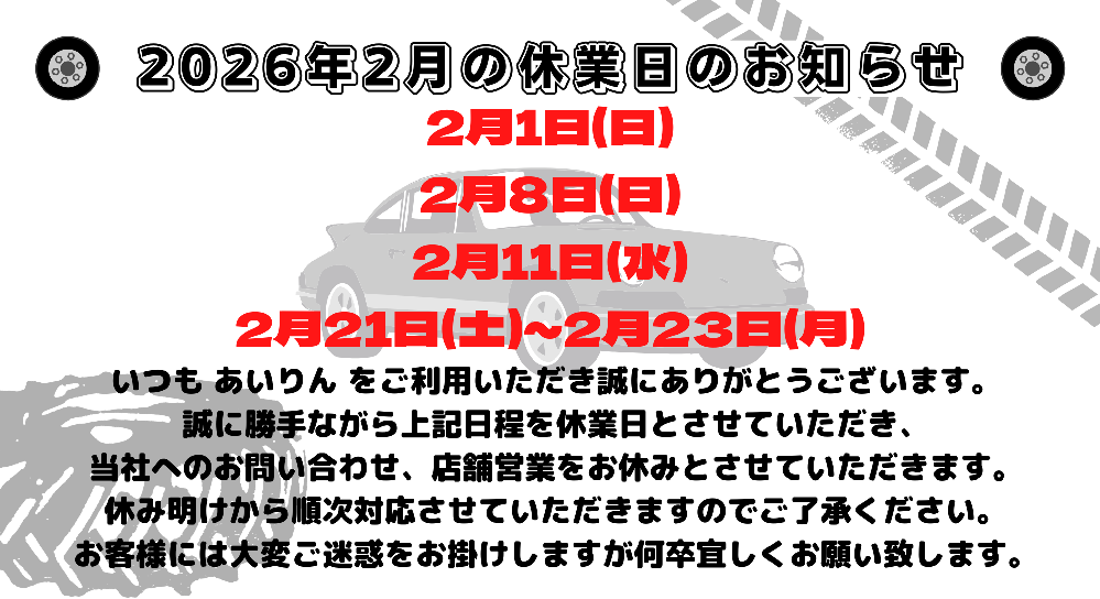 ◆◇2026年 2月 休業日のお知らせ◇◆